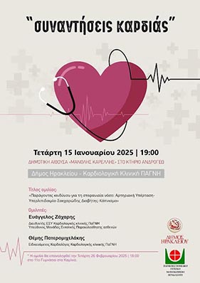 «Παράγοντες κινδύνου για τη στεφανιαία νόσο: Αρτηριακή Υπέρταση-Υπερλιπιδαιμία-Σακχαρώδης Διαβήτης-Κάπνισμα» είναι το θέμα της ομιλίας που θαπραγματοποιηθεί αύριο Τετάρτη 15 Ιανουαρίου...