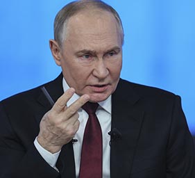 epa11785305 Russian President Vladimir Putin gestures as he answers questions during his annual live broadcast press conference with Russian federal,...