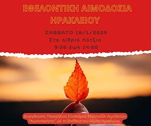Το Σάββατο 18 Ιανουαρίου 2025 θα πραγματοποιηθεί εθελοντική αιμοδοσία στοκέντρο της πόλης του Ηρακλείου και συγκεκριμένα στο αίθριο της Λότζια...