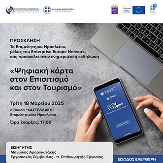 «Ψηφιακή κάρταστον Επισιτισμό και στον Τουρισμό»Αύριο, Τρίτη 18 Μαρτίου 2025αίθουσα ΚΑΣΤΕΛΛΑΚΗ Επιμελητηρίου Ηρακλείου Ώρα έναρξης: 17:00ΕΙΣΗΓΗΤΗΣΜανώλης Αμαργιωτάκης Εργασιακός Σύμβουλος -...
