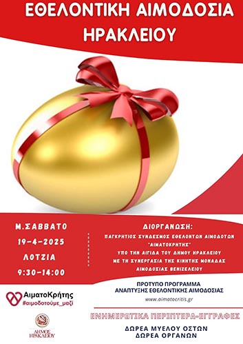 Το Σάββατο 19 Απριλίου 2025 θα πραγματοποιηθεί εθελοντική αιμοδοσία στο κέντροτης πόλης του Ηρακλείου και συγκεκριμένα στο αίθριο της Λότζια...