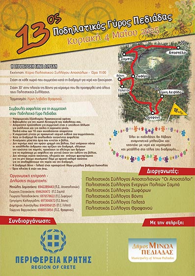 Την Κυριακή 4 Μαΐου 2025, θα πραγματοποιηθεί ο 13ος Ποδηλατικός Γύρος Πεδιάδας,κατά τη διάρκεια του οποίου, οι ποδηλάτες θα ακολουθήσουν...