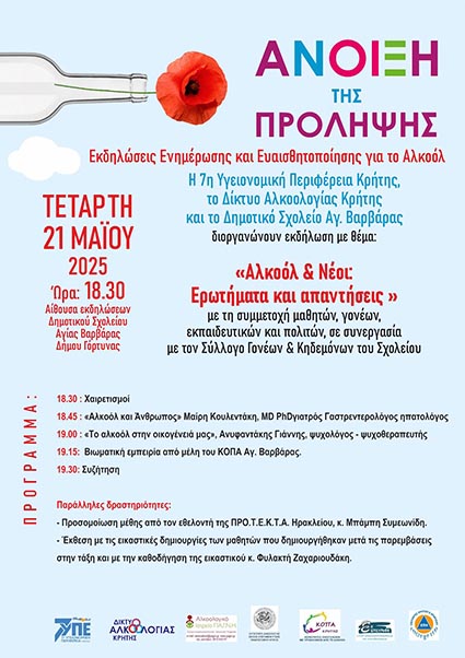 Συνεχίζονται από την 7η Υγειονομική Περιφέρεια και το Δίκτυο Αλκοολογίας Κρήτης οι εκδηλώσεις Ενημέρωσης και Ευαισθητοποίησης για το Αλκοόλ σε όλη...