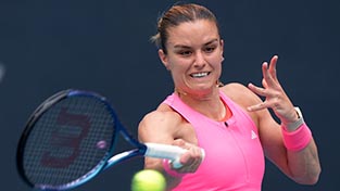 Maria Sakkari, of Greece, hits a return to Coco Gauff during the Miami Open tennis tournament, Saturday, March 22, 2025,...