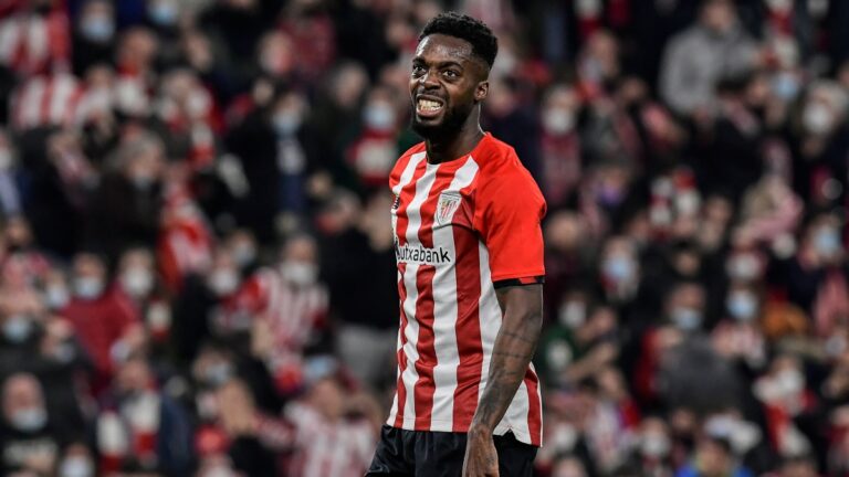 FILE - Athletic Bilbao's Inaki Williams reacts during a Spanish Copa del Rey semifinal first leg soccer match between Athletic...
