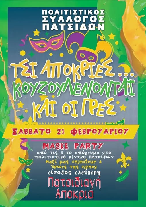 Το Σάββατο 21 Φεβρουαρίου ο Πολιτιστικός Σύλλογος Πατσίδων σας προσκαλεί στην Πατσιδιανή Αποκριά! ΤΣΙ ΑΠΟΚΡΙΕΣ....ΚΟΥΖΟΥΛΕΝΟΝΤΑΙ ΚΑΙ ΟΙ ΓΡΕΣ!!!!! Το μεγάλο...