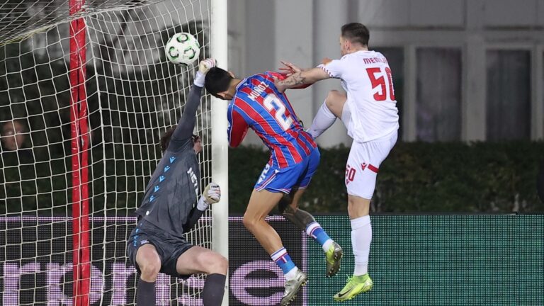 Crystal Palace's goalkeeper Dean Henderson saves in front of Zrinjski's Kerim Memija during Europa Conference League play-off soccer match between...