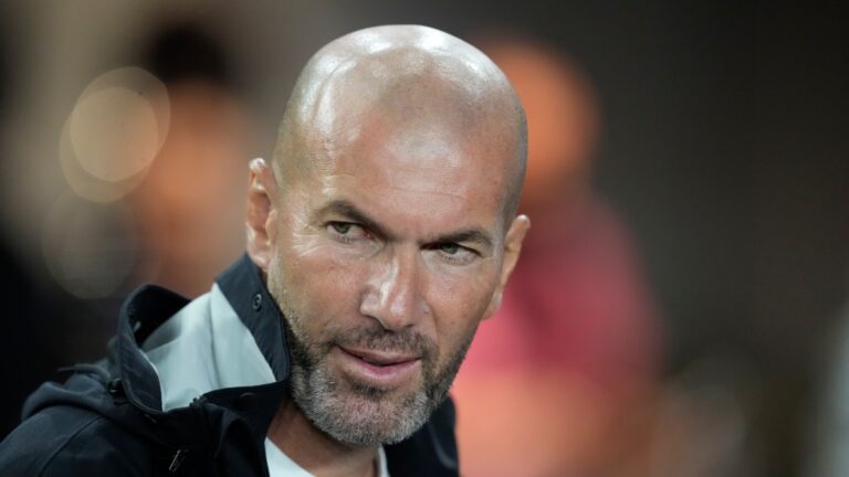 French soccer manager and former player Zinedine Zidane stands in the Inter Miami owner's suite at the start of U.S....