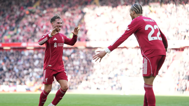 Liverpool's Alexis Mac Allister, left, and Liverpool's Hugo Ekitike celevrate after a goal during the Premier League soccer match between...