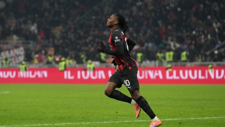 AC Milan's Rafael Leao celebrates after scoring his side's opening goal during the Serie A soccer match between AC Milan...