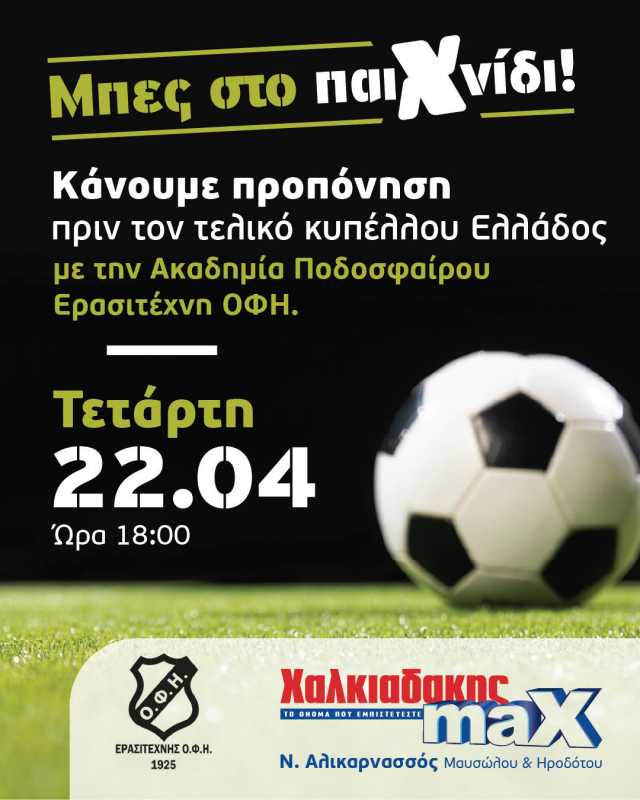 Τα S/M Χαλκιαδάκης, ο Eρασιτέχνης ΟΦΗ και η ακαδημία ποδοσφαίρου του συλλόγου μπαίνουν σε ρυθμούς τελικού Κυπέλλου Ελλάδος! Την Τετάρτη 22/04, στις...