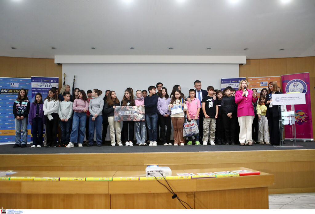 Στην κατάμεστη από μαθητές όλων των εκπαιδευτικών βαθμίδων αίθουσα του Υπουργείου Παιδείας, Θρησκευμάτων και Αθλητισμού, πραγματοποιήθηκε, την Τρίτη 12/12/2023, η τελετή απονομής βραβεύσεων των σχολικών μονάδων που διακρίθηκαν για τη συμμετοχή τους στην Πανελλαδική Σκυταλοδρομία «Τρέχω για το ΕΥ».