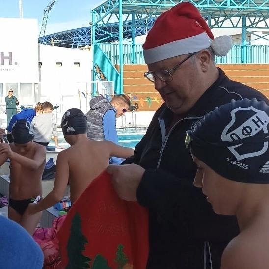 Σε ρόλο Άγιου Βασίλη, ο επικεφαλής προπονητής της κολύμβησης του ΟΦΗ,Γιάννης Ζελεσκίδης, ο οποίος ανταποκρίθηκε άριστα, στο ρόλο του.