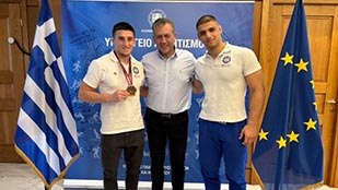 Τους διακριθέντες αθλητές στο πρόσφατο Ευρωπαϊκό Πρωτάθλημα Πάλης U23, Αρίωνα Κολιτσόπουλο και Νίκο Καραβάνο, υποδέχθηκε σήμερα στο γραφείο του ο αναπληρωτής Υπουργός Αθλητισμού, Γιάννης Βρούτσης.