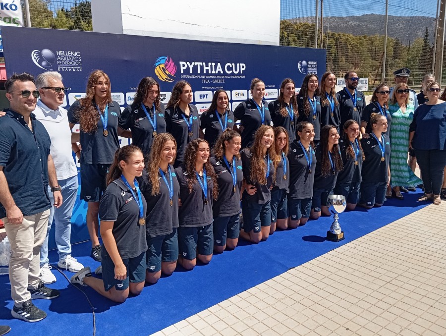 Το τρόπαιο στα χέρια της Εθνικής μας ομάδας. Τα κορίτσια του Γιώργου Ντόσκα κατέκτησαν το χρυσό μετάλλιο στο διεθνές τουρνουά Υδατοσφαίρισης «PYTHIA CUP 2025-WOMEN U18», που ολοκληρώθηκε σήμερα (29/8) το μεσημέρι στο κολυμβητήριο της Ιτέας, αφού επιβλήθηκαν σχετικά άνετα της Ουγγαρίας με 16-10.
