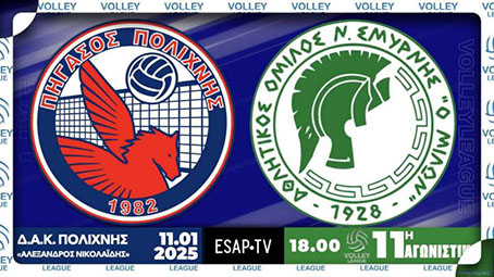 | 11/01/2025: | Volley League | 11η | Πήγασος Πολίχνης – Α.Ο.Ν.Σ.Μίλων | |