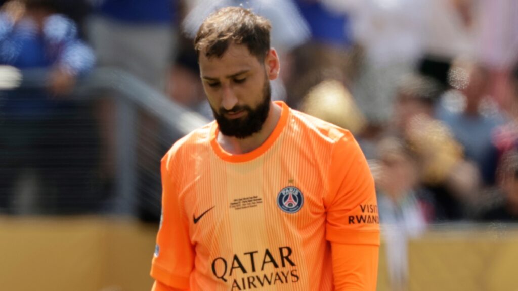 Paris Saint-Germain’s goalkeeper Gianluigi Donnarumma reacts after conceding a third goal during the Club World Cup final soccer match between Chelsea and PSG in East Rutherford, N.J., Sunday, July 13, 2025. (AP Photo/Adam Hunger)