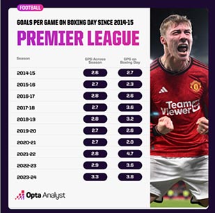 Σημειώθηκαν 19 γκολ σε πέντε αγώνες την περασμένη σεζόν «Boxing Day» (3,8 ανά παιχνίδι), 25 σε επτά αγώνες μία πιο πίσω σεζόν (3,6 ανά παιχνίδι) και 28 γκολ σε μόλις έξι παιχνίδια το 2021-22 (4,7 ανά παιχνίδι).