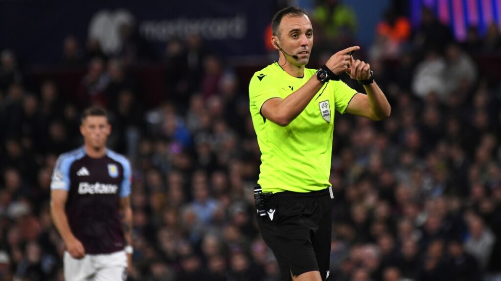 Referee, Portugal’s Joao Pinheiro during the Champions League opening phase soccer match between Aston Villa and Bologna at the Villa Park in Birmingham, England, Tuesday, Oct. 22, 2024. (AP Photo/Rui Vieira)