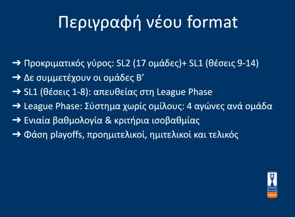 Το Κύπελλο Ελλάδας αλλάζει ριζικά και θα μοιάζει ελάχιστα με τη μορφή που είχε μέχρι και τη φετινή σεζόν, καθώς αναμένεται να διεξαχθεί με προκριματικό γύρο και μορφή League Phase, στα πρότυπα των διοργανώσεων της UEFA.