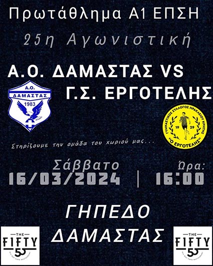 “Για την 25η αγωνιστική του πρωταθλήματος της Α1 ΕΠΣΗ η ομάδα μας φιλοξενεί στην Δαμάστα το Σάββατο 16/03/24 τον ιστορικό Εργοτέλη. Ώρα έναρξης του αγώνα 16:00.