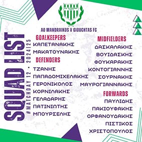 👉Η 20αδα που επιλέχθηκε για την 12η «μάχη» του πρωταθλήματος είναι: Μακατουνάκης, Καπετανάκης, Τζανής, Παπαδομιχελακης Γερονικολός, Κορνιλάκης, Γελαδάρης, Πατινιώτης, Μπουρσέλης, Δασκαλάκης, Βουϊδάσκης, Φουκαράκης , Κοντογιαννης, Σουρνάκης, Μαυρογιαννάκης, Παυλίδης, Πακιουφάκης, Ορφανουδάκης, Πιστικός, Χριστόπουλος.