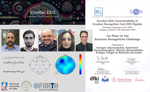 Στα πλαίσια του διεθνώς αναγνωρισμένου συνεδρίου 12th International Conference on Affective Computing & Intelligent Interaction (ACII) (https://acii-conf.net/2024), το οποίο πραγματοποιήθηκε στη Γλασκώβη της Σκωτίας 15-19/09/2024, διοργανώθηκε ανοιχτός διεθνής διαγωνισμός (https://emotionlab.github.io/EmoRec-EEG/challenge) για την αναγνώριση του υποκείμενου συναισθήματος μέσω ανοιχτά διαθέσιμων δεδομένων ηλεκτροεγκεφαλογραφήματος (EEG). Στον διαγωνισμό συμμετείχαν συνολικά 5 ερευνητικές ομάδες και 13 ερευνητές οι οποίοι διαγωνίστηκαν στην εύρεση της πιο αποδοτικής μεθόδου εκτίμησης συναισθημάτων από τα δεδομένα.