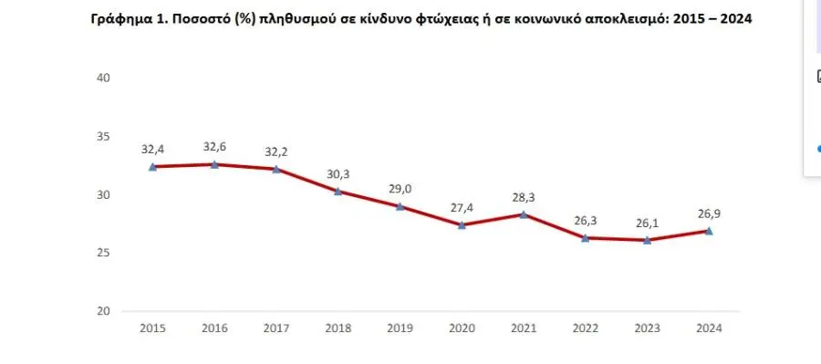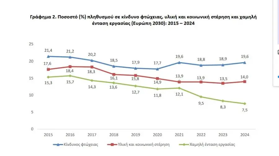 Σύμφωνα με την έρευνα εισοδήματος και συνθηκών διαβίωσης των νοικοκυριών από την ΕΛΣΤΑΤ, η αύξηση του ποσοστού του κινδύνου φτώχειας ή κοινωνικού αποκλεισμού (δείκτης που συντίθεται από τους επιμέρους δείκτες του κινδύνου φτώχειας, της υλικής και κοινωνικής στέρησης και της χαμηλής έντασης εργασίας) οφείλεται στην αύξηση του ποσοστού κινδύνου φτώχειας, σε 19,6% το 2024 από 18,9% το 2023 και της υλικής και κοινωνικής στέρησης σε 14% το 2024 από 13,5% το 2023.