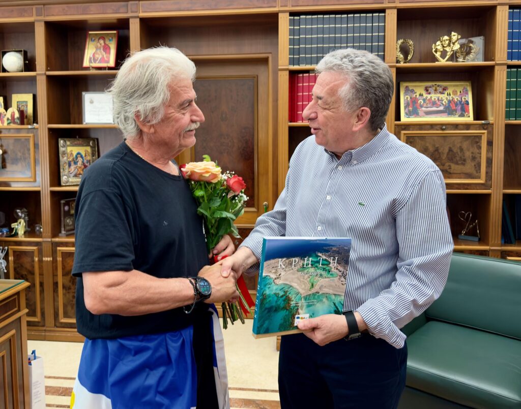 Τον αθλητή υπεραποστάσεων Θεοχάρη Αθητάκη υποδέχθηκε σήμερα στο κτίριο της Περιφέρειας ο Περιφερειάρχης Κρήτης Σταύρος Αρναουτάκης, με αφορμή την ολοκλήρωση της ιστορικής διαδρομής 153 χιλιομέτρων που πραγματοποίησε ο αθλητής από την Ανώπολη Σφακίων προς το Ηράκλειο.