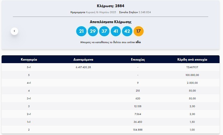 Κοινωνία - Πολιτική Τζακ – ποτ στις δύο πρώτες κατηγορίες 1 έτος ago About Author admin See author's posts Μοιραστείτε το: Continue Reading Previous Παραιτήθηκε ο υφυπουργός ανάπτυξης Αρίστος ΔοξιάδηςNext Με επιτυχία η άσκηση για την αντιμετώπιση φυσικών καταστροφών στο 2ο Δημοτικό Σχολείο Βουτών