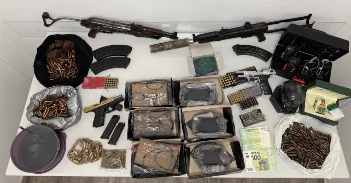 Ακολούθησαν έρευνες στις οικίες τους, όπου βρέθηκαν πιστόλια και πολεμικά τυφέκια, πλήθος φυσιγγίων, εκρηκτικές ύλες, βραδύκαυστα φυτίλια, πολυτελή ρολόγια και πλήθος κλειδιών αυτοκινήτων.