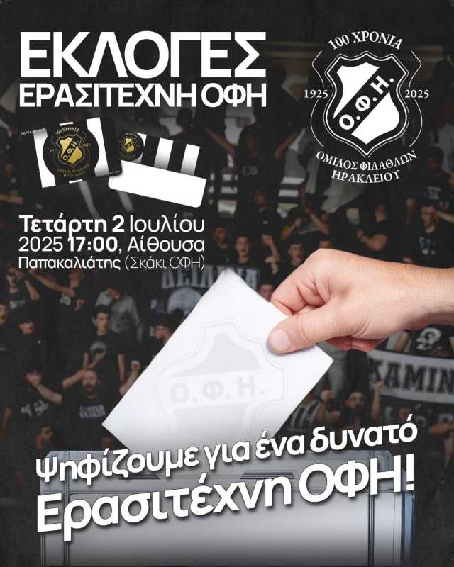 Την Τετάρτη 2 Ιουλίου 2025 και ώρα 5μμ, ψηφίζουμε για τον Ερασιτέχνη ΟΦΗ.