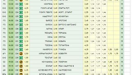 1607. Τόρεντ – Πένια Ιντεπέντεντ 1 (1.64) ή OVER (2.35)280. Εμπολι – Μίλαν 2 (1.58) ή OVER (1.68)281. Γιούχτας – Καλαμάτα 12 ((3.25 – 2.10)286. Ηρακλής Α.Ε.Λ. 12 (2.90 – 2.35)290. Τηλυκράτης – Χανιά X2 (3.50 – 1.45) ή OVER (2.27)297. Ιστανμπουλσπόρ – Φενέρμπαχτσε OVER 3.5 (2.20)305. Γουέστ Χαμ – Μπρίστολ Σίτι OVER OVER (1.64)315. Παναθηναϊκός – Παναιτωλικός 1 Από Α ημίχρονο (1.58) ή OVER (1.52)326. Γαλατασαράϊ – Κόνιασπορ OVER (1.60) ή OVER 3.5 (2.70)
