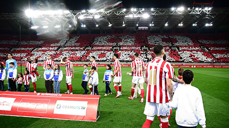 Η ομάδα του Χοσέ Λουίς Μεντιλίμπαρ έκανε την είσοδό της στο χορτάρι του “Γεώργιος Καραϊσκάκης” για την αναμέτρηση με τον ΟΦΗ, υπό τους ήχους του πρώτου ύμνου στην ιστορία του συλλόγου.
